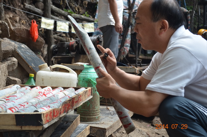 該項目是我隊繼小秦嶺整裝勘查潼關自有礦權區(qū)中深部探礦系統工程之后的又一探礦項目。在總公司領導的關心支持下,隊主要領導非常重視,多次前往項目實施地進行現場檢查指導。目前,項目相關手續(xù)辦理及鉆探施工正有序進行,總體進展順利,鉆孔不同深度見有多層礦化。在檢查ZK503提取的巖心時,王隊長手持地質放大鏡仔細查看,他要求施工和相關技術人員要隨時注意巖心變化情況,特別對不同標高段出現的不同地質情況要認真記錄、仔細分析、及時報告,不能漏掉任何細節(jié)。