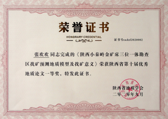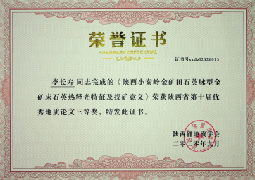 由我公司地調(diào)所編制完成的“小秦嶺金礦田深部及外圍金礦整裝勘查區(qū)(陜西)礦產(chǎn)調(diào)查找礦預(yù)測子項(xiàng)目(石門幅)成果報告”獲陜西省第十屆優(yōu)秀地質(zhì)成果三等獎;張歡歡同志撰寫的“陜西小秦嶺金礦床三位一體勘查區(qū)找礦預(yù)測地質(zhì)模型及找礦意義”獲優(yōu)秀地質(zhì)論文一等獎;李長壽同志撰寫的“陜西小秦嶺金礦田石英脈型金礦床石英熱釋光特征及其找礦意義”獲優(yōu)秀地質(zhì)論文三等獎。